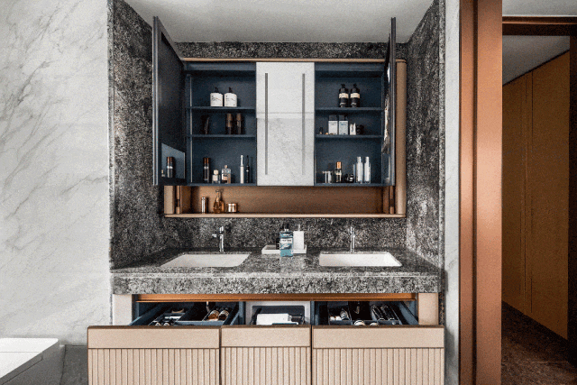 主卫浴室柜也是突破性的壁龛+悬空柜体+内嵌美妆冰箱+浴室柜三组抽屉组合,可归置更多主人物品…