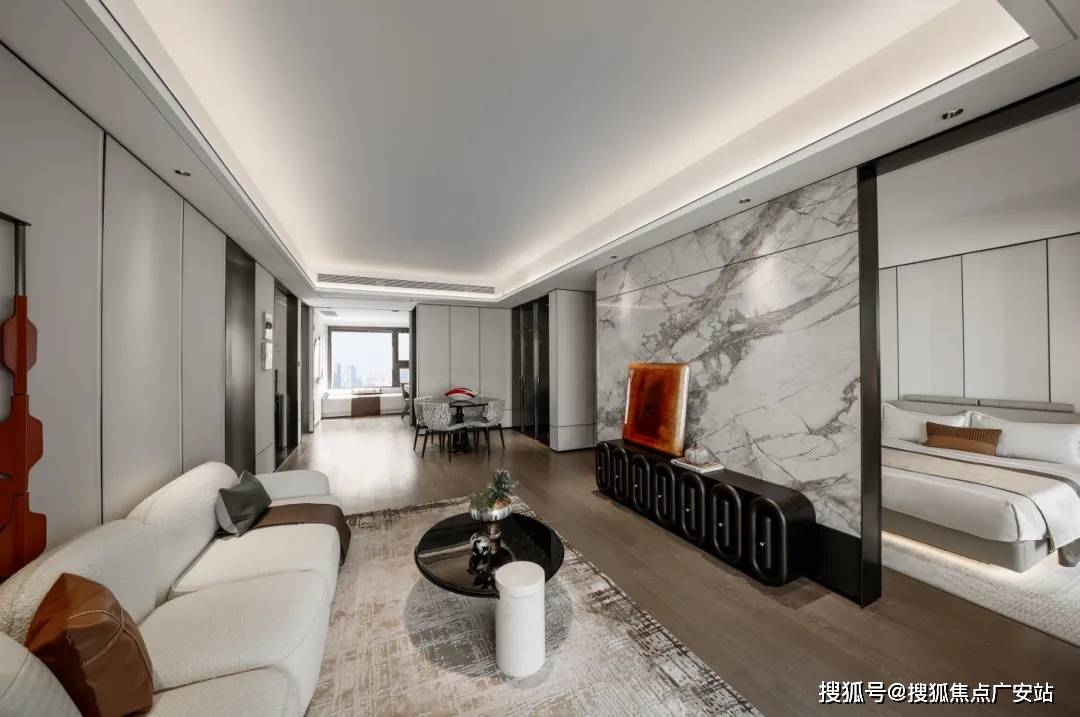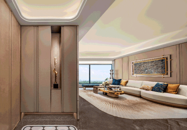 最强的一点是,它的奢感一进入室内就直接扑面而来:奔驰S级轿车内饰同款的白栓影木木饰面&仿石拼花瓷砖的玄关、客厅背景墙是星级酒店同款的一整面白金沙,加上卫浴间采用艾伦蓝、卡里冰玉、佩纳深蓝等奢石铺装,奢石含量严重超标;