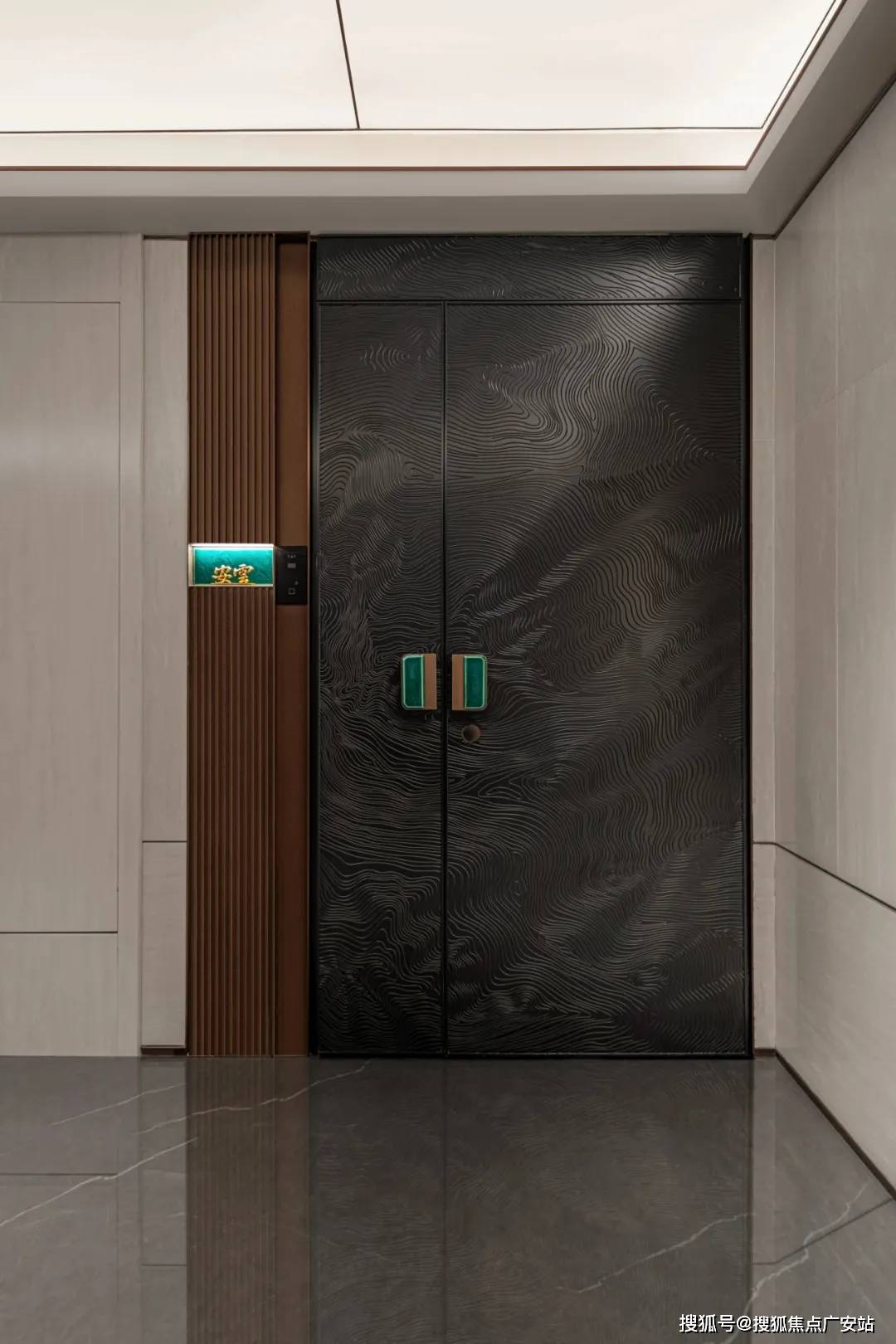 还有首层轿厢内电梯门也特别做了定制细节处理,使用金属蚀刻工艺不锈钢电梯门,高定专属纹案,近看能摸到细腻的凹凸质感;电梯厅内采用维多利亚绿奢石和温德姆灰石材打造,匹配类独厅设计的归家尊仪……奢石大量运用于公区,与超级豪宅相比都毫不逊色。