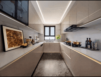 室内更是定制多项人性化细节设计:美学弧形吊顶、转角采用圆弧阳角处理、厨房门选用吊轨无门槛的约5mm钢化浅茶玻璃门、人字拼地板、阳台大落地窗玻璃整体封包交付……