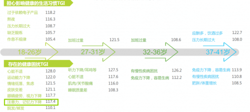 艾瑞咨询联合数字健康管理平台好轻发布的《中国健康管理白皮书》显示,18-26岁受访群体中,注意力、记忆力下降的困扰TGI高达117.4,明显高于其他年龄段;