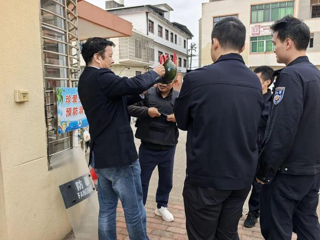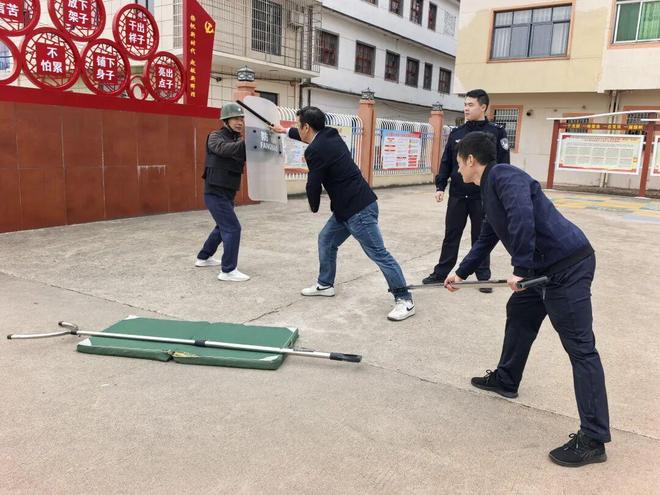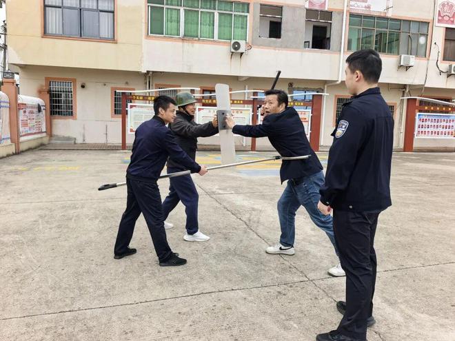 演练始于扎实的学习培训。罗湖镇派出所的民警在学校保卫室门口,向保安以及由万东达老师带头组成的校园安全护卫队进行了系统讲解。民警将防暴盾牌、钢叉、防暴喷雾、警棍等常用安保器械一一陈列,仔细说明了每件器械的适用场景、使用技巧和注意事项,并进行了标准的示范操作。参训人员神情专注,认真学习,为后续的实战操作筑牢了坚实的理论基础。
