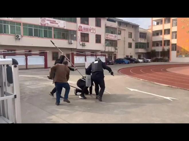 最后是模拟实战检验环节。由学校门卫扮演的“暴徒”突然试图强行闯入校门。值班老师发现后,立即启动一键式报警系统,同时利用身边的防暴器械进行先期阻拦与周旋。警报响起后,刚刚完成编组训练的“三人最小作战单元”迅速携带装备奔赴现场。他们利用盾牌进行有效格挡,用钢叉精准限制“暴徒”行动,几人协同配合,迅速将其合围并成功制服。整个处置过程紧张但有序,环节清晰,配合默契。