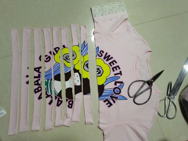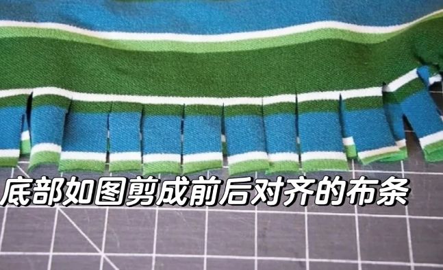 首先找个颜值不错的T恤,然后按照这样的方式裁剪一下,底摆剪成一条一条,如果你想要流苏的款式,那就直接将布条打结,