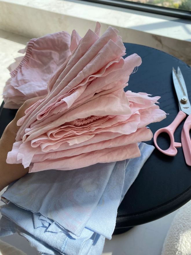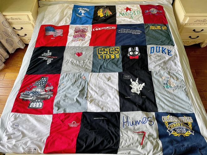 如果不穿的T恤数量比较多,我们还可以把它们裁剪成一样的大小布块,然后把它们拼接在一起就能得到一个床单。