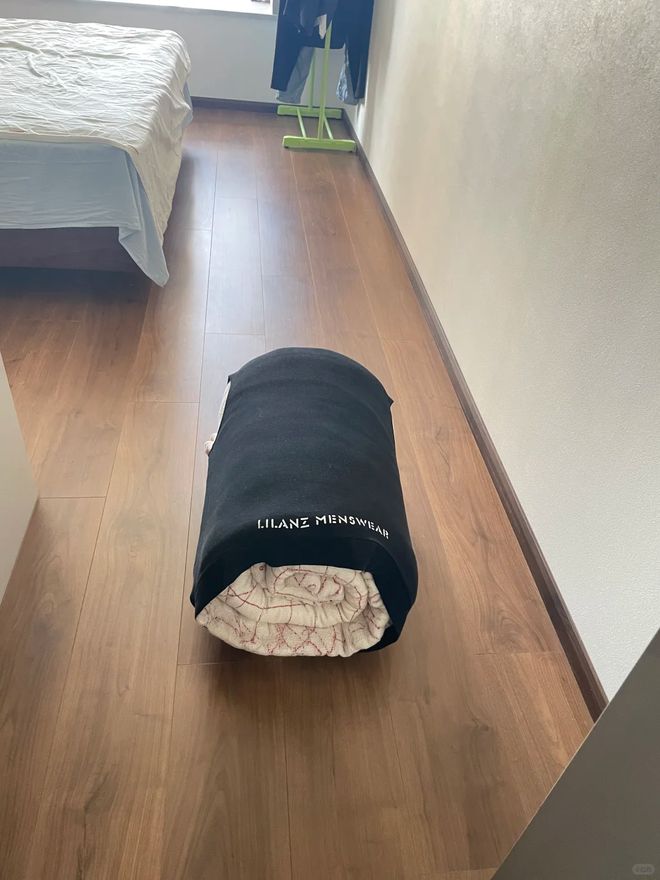 可不要忘记忘记收纳箱本身也很占地方,真的没有T恤节省空间来的实实在在。我们就把需要收纳的被褥卷起来,然后塞进不穿的T恤中,