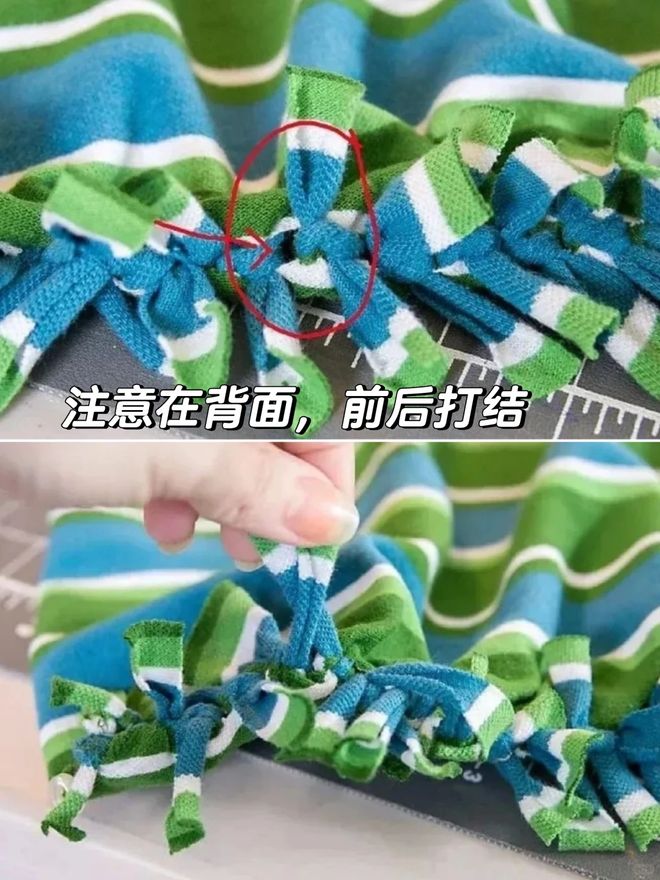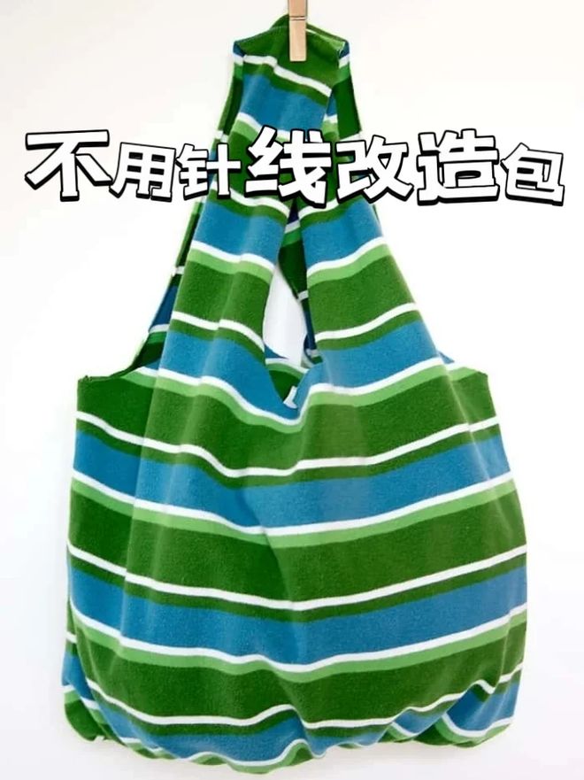 不喜欢啰嗦的,就把衣服翻过来再将这些布条一一打结,系好之后翻过来,不动一阵一线,就能得到一个手提袋。而且还挺能装,不比花钱买的袋子差呢!