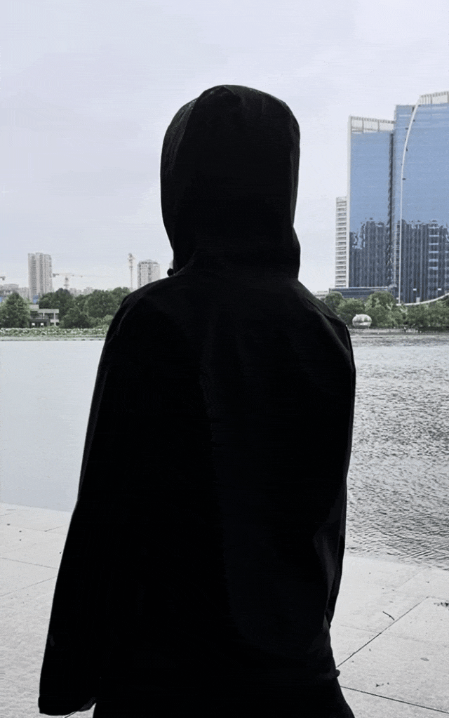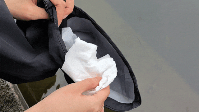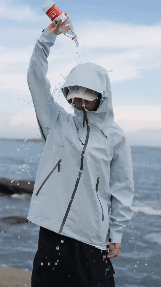 我们直接上手实测实拍,在衣服上狂泼水模拟暴雨场景(水量大得小编都站不稳了),水珠瞬间就滑落下去,防水硬实力真抗打。