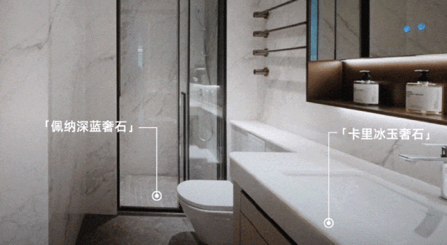 最强的一点是,它的奢感一进入室内就直接扑面而来:奔驰S级轿车内饰同款的白栓影木木饰面&仿石拼花瓷砖的玄关、客厅背景墙是星级酒店同款的一整面白金沙,加上卫浴间采用艾伦蓝、卡里冰玉、佩纳深蓝等奢石铺装,奢石含量严重超标;